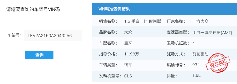 【通过车架号VIN查询车辆信息】即可获取车辆出厂年份、车身颜色、轮胎型号、配置版本等专业信息。广泛应用于购买新车、二手车交易、保险定损、交警系统、购买配件、查看配件装配图和车辆维修等领域。