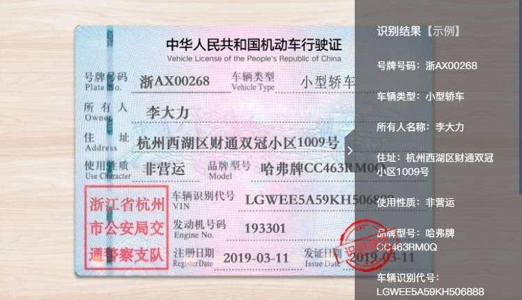 识别行驶证首页和副页关键字段内容,包括品牌型号、车辆类型、车牌号码、检验记录、核定载质量、核定载人数等信息