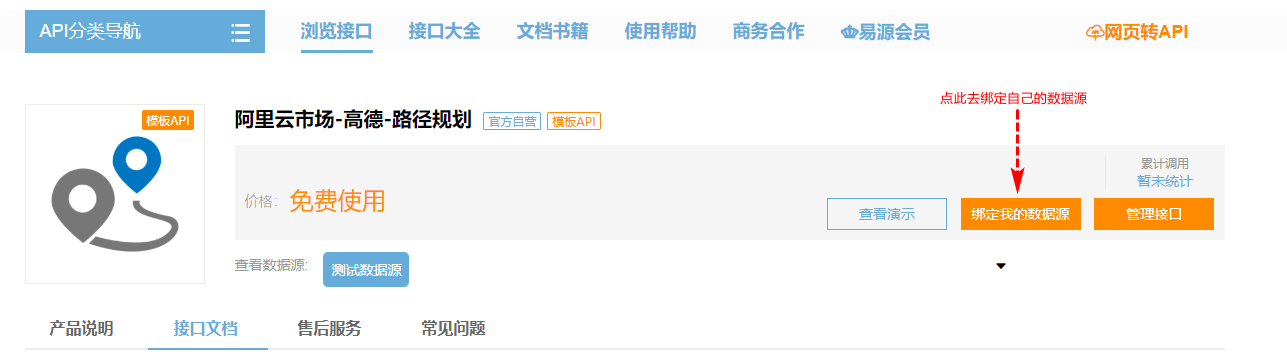 由于我们用的是模板API,系统会根据此模板复制出一个用户自己私有的API,因此会跳转到以下页面,最重要的就是绑定刚才创建好的数据源。如下图所示: