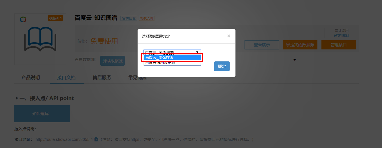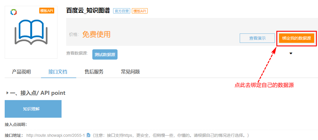 由于我们用的是模板API,系统会根据此模板复制出一个用户自己私有的API,因此会跳转到以下页面,最重要的就是绑定刚才创建好的数据源。如下图所示: