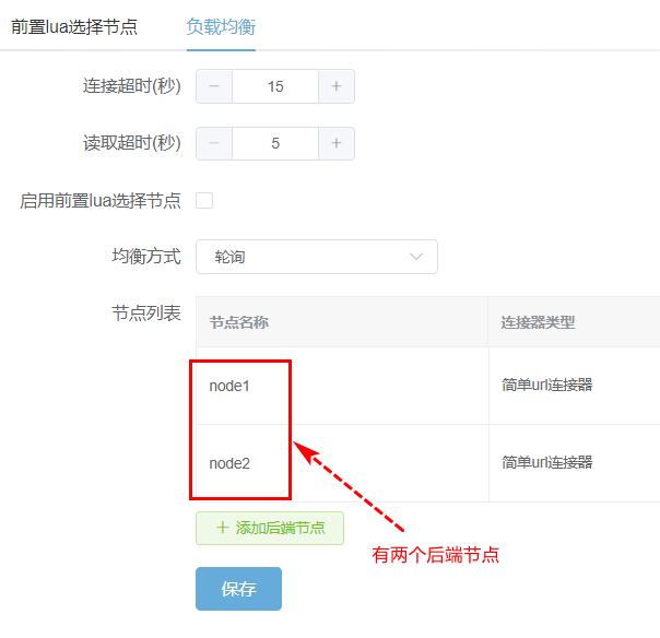 在有多个后端节点的时候,易源会把选中的节点名称,传入lua回调函数中。这样代码可以根据不同的节点,进行不同的业务逻辑操作。例如下图就有node1和node2两个节点。