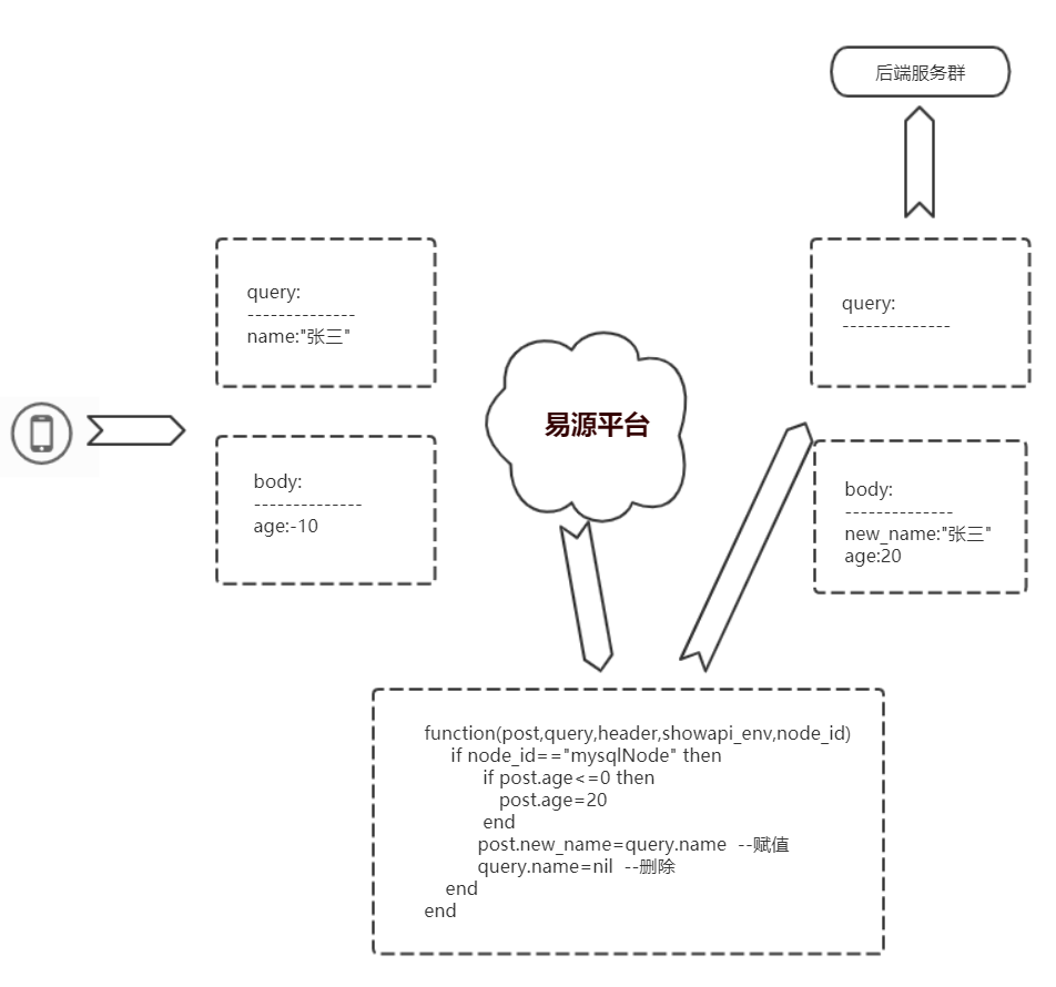 如果需要使用比字段映射更强的功能(比如复杂的逻辑判断),可以使用【代码转换】功能,嵌入LUA代码直接修改输入参数。本功能逻辑图如下: