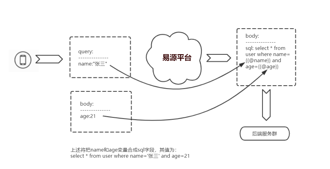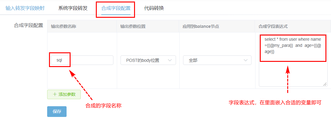 根据输入参数+环境变量,合成新的参数。图中的{{@变量}}是mustache语法,表明其会应用【反sql注射】操作。