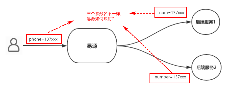 比如我们要连接手机归属地查询接口,有两个API源(比如阿里市场上两个服务商提供的【手机归属地】接口),它们的输入参数分别是num和number,而我们的接口定义的输入参数是phone,如图所示: