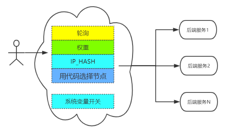 经过前面的小节,我们了解了如何添加节点以及如何使用变量进行节点启停,在多节点时,易源根据您的配置对它们进行IP_HASH、轮询、权重分流负载。在一些特别的情况下,我们可能会对选择哪个后端节点有强制的要求。如下图的需求: