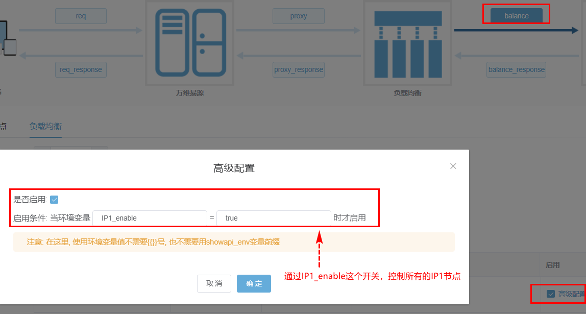 在上面的图中我们看到了有四个IP1节点(如果您的API有100个以上,那大概率IP1节点也会出现100多次),在这种情况下,我们手动操作后端节点启停就太繁琐了。必须有一个办法,只操作一次,就让走IP1服务器的所有节点都关闭(或启动)。在易源平台,我们可以使用环境变量+启停高级配置的组合来完成这个需求。