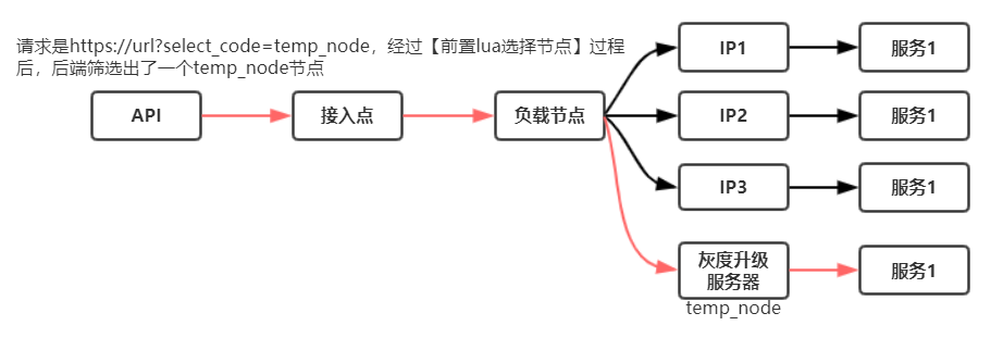 在原来的集群上,我们对后端服务做了升级,打算将升级后的节点加入到工作节点列表中。加入后,我们希望在前端get过来的请求url中,必须带了select_code=temp_node参数的,这个请求才走新添加这个升级节点,这样我们可以很方便控制前端的测试流量。其流程如下图: