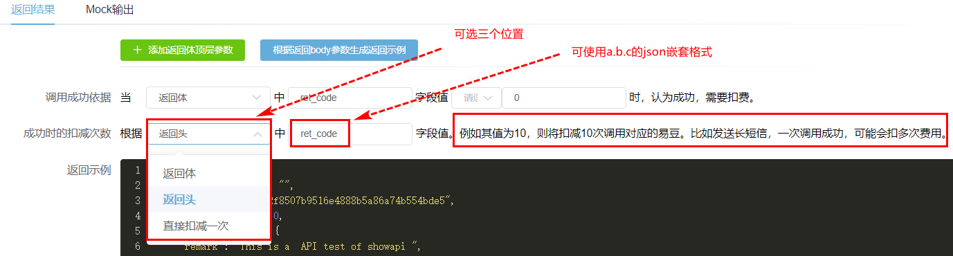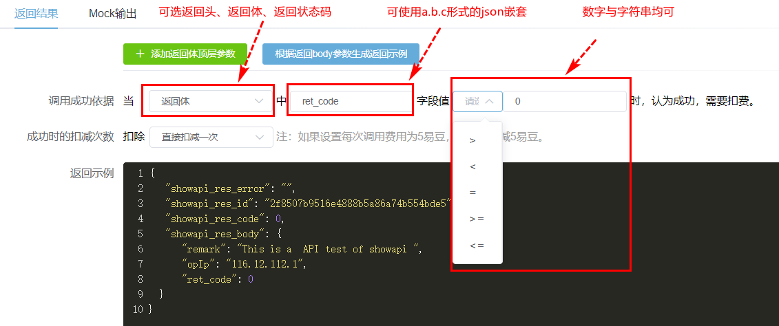 **1.定义返回结果(返回字段、成功依据、扣费次数)**