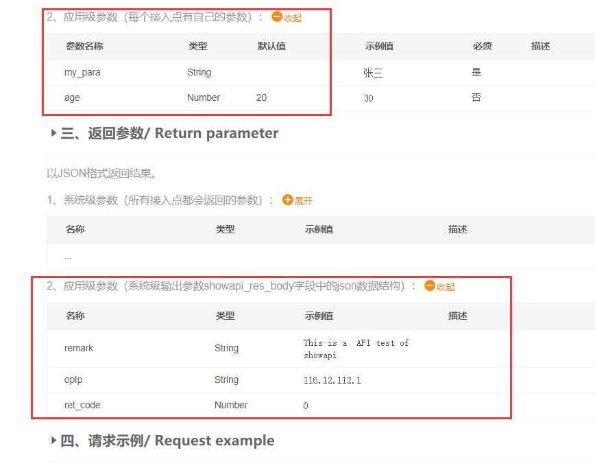 可定义返回头和返回body,定义好的内容将于文档形式出现在接入点详情页,例如下面的区域: