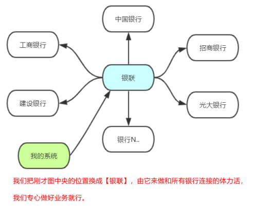 银联把所有银行连接起来,对外提供统一接口。银联网络内加入新的银行后,我们的系统可以直接和新银行交互。