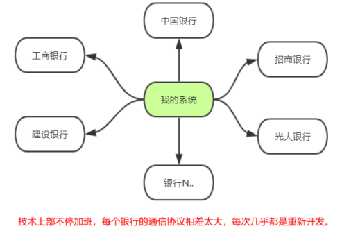 每个银行有自己的签权、输入、输出文档,有的是http,有的是拼字符串的socket,有的是拼byte数组,还有的要对数据进行异或移位操作(比如8583协议)。开发周期比较长,成本自然就高。对于银行和开发者,都不愿意看到这样的情况。