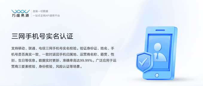 手机号3要素实名核验:直连国内四大运营商(移动/联通/电信/广电),输入姓名、身份证号、手机号,毫秒级